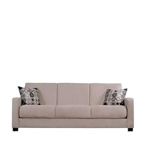 Transitionally designed sofa sleeper has track arms. Converts into a full size bed with the touch of a hand. Tapered wooden legs with an espresso finish. Sofa sleeper is a very versatile piece of furniture that has a three position hinge which allows you to sit, lounge or sleep 2 comfortably. 10-inch pillow top seat cushion for extra comfort. Covered in a 100-percent polyester high performance Khaki microfiber. No bar in the back for added sleeping comfort. Upholstered back and arms for center of the room placement. Cushion accommodates full size sheets for sleeping. All powder coated steel seat and back frames and metal to metal connections for strength and durability. Innovative engineering and design enables this sofa to fit through an 8 inch opening. Efficient product design uses less fossil fuel based components in construction and delivery. Various components are recyclable at the end of use. Each piece ships in one (1) box. Assembly required. Includes 2 decorative throw pillows. Welcome to Handy Living: Your kind of furniture. Right. Now. Their goal is simple: put full size upholstered furniture in a single box that will ship via common carrier to every doorstep. Handy Living has made everyday furniture exciting and different. They believe furniture should be stylish and fun. It should be affordable. It should be easy to deliver quickly and conveniently in a single box - and ridiculously easy to assemble. And it should be environmentally responsible. Handy Living - Thinking Inside the Box.